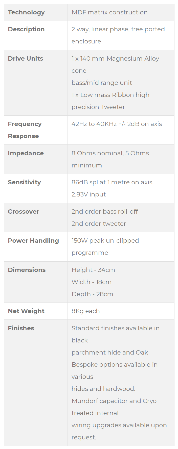 Drive Units 1 x 140 mm Magnesium Alloy cone bass/mid range unit, 1 x Low mass Ribbon high precision Tweeter